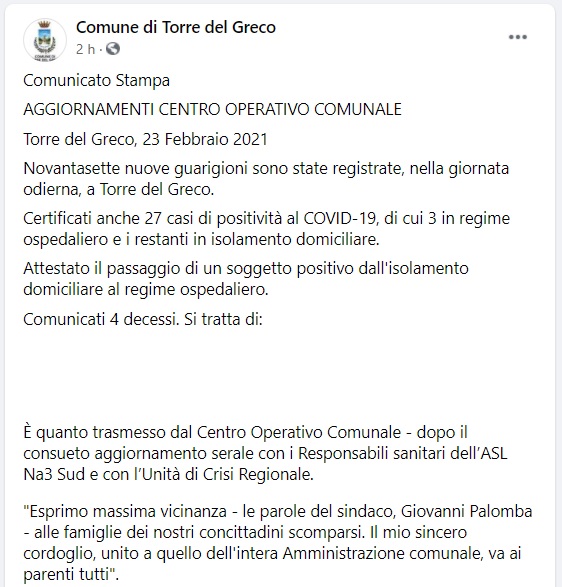 Questo il messaggio di cordoglio che apprendiamo dalla pagina facebook del Comune di Torre del Greco: "Comunicato Stampa AGGIORNAMENTI CENTRO OPERATIVO COMUNALE Torre del Greco, 23 Febbraio 2021 Novantasette nuove guarigioni sono state registrate - si legge nella nota -, nella giornata odierna, a Torre del Greco. Certificati anche 27 casi di positività al COVID-19, di cui 3 in regime ospedaliero e i restanti in isolamento domiciliare. Attestato il passaggio di un soggetto positivo dall'isolamento domiciliare al regime ospedaliero. Comunicati 4 decessi - si legge nella nota -. Si tratta di: ... . È quanto trasmesso dal Centro Operativo Comunale - dopo il consueto aggiornamento serale con i Responsabili sanitari dell’ASL Na3 Sud e con l’Unità di Crisi Regionale. "Esprimo massima vicinanza - le parole del sindaco, Giovanni Palomba - alle famiglie dei nostri concittadini scomparsi. Il mio sincero cordoglio - si legge nella nota -, unito a quello dell'intera Amministrazione comunale, va ai parenti tutti"."