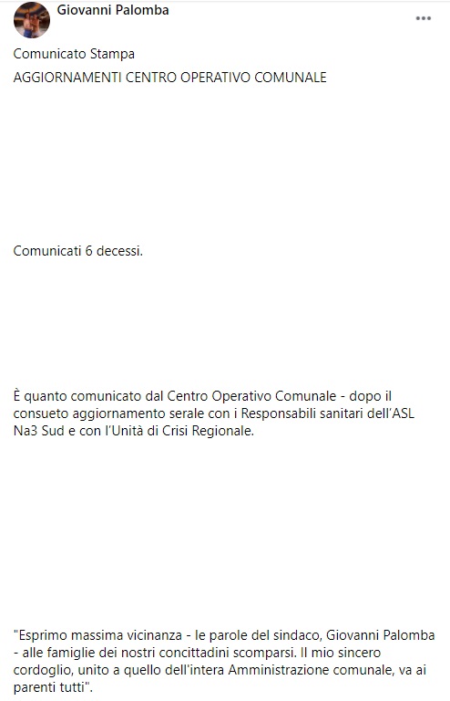 Questo parte di quanto apprendiamo dal profilo facebook del Sindaco di Torre del Greco, Palomba: