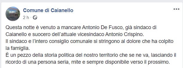 Questo quanto pubblicato sulla pagina facebook del Comune di Caianello: