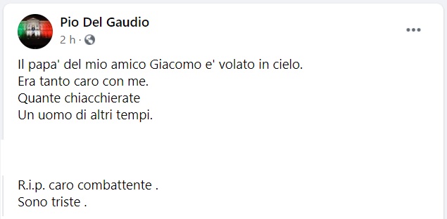 Questo quanto apprendiamo dalla pagina facebook dell'ex Sindaco di Caserta Pio Del Gaudio: "Il papa' del mio amico Giacomo e' volato in cielo. Era tanto caro con me - si legge nella nota -. Quante chiacchierate Un uomo di altri tempi. R.i.p. caro combattente - si legge nella nota -. Sono triste."