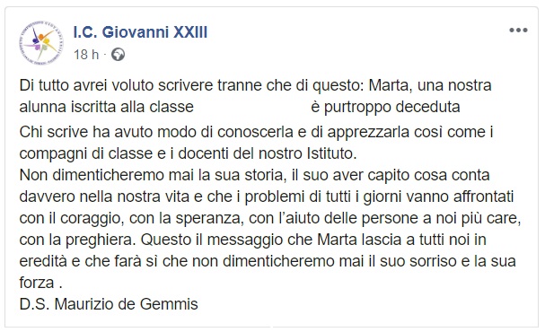 Questo quanto apprendiamo dalla pagina FB della scuola I.C. Giovanni XXIII