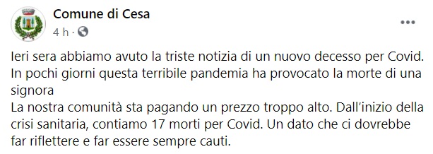 Questo quanto apprendiamo dalla pagina facebook del Comune di Cesa: "Ieri sera abbiamo avuto la triste notizia di un nuovo decesso per Covid. In pochi giorni questa terribile pandemia ha provocato la morte di una signora - si legge nella nota - ... . La nostra comunità sta pagando un prezzo troppo alto. Dall’inizio della crisi sanitaria, contiamo 17 morti per Covid. Un dato che ci dovrebbe far riflettere e far essere sempre cauti."