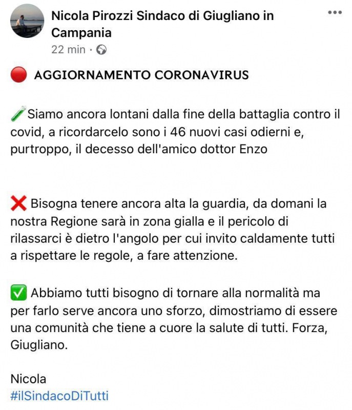Questo quanto pubblicato sulla pagina facebook del Sindaco di Giugliano