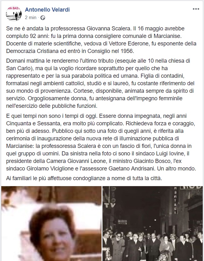 Il Sindaco di Marcianise Antonello Velardi annuncia così la scomparsa della Prof.ssa Scalera.