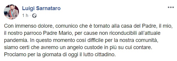 Questo qunato pubblicato sulla pagina facebook del Sindaco Sarnataro: