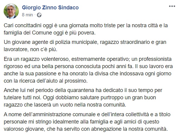 Questo quanto apprendiamo dalla pagina facebook del Sindaco Zinno: