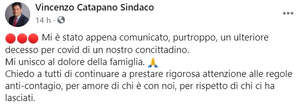 Questo il messaggio di cordoglio pubblicato sulla pagina fb del Sindaco Catapano: "Mi è stato appena comunicato, purtroppo, un ulteriore decesso per covid di un nostro concittadino. Mi unisco al dolore della famiglia. - si legge nella nota - Chiedo a tutti di continuare a prestare rigorosa attenzione alle regole anti-contagio, per amore di chi è con noi, per rispetto di chi ci ha lasciati."
