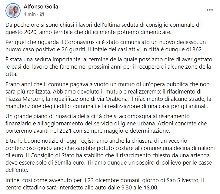Questo quantoa apprendiamo dalla pagina facebook del Sindaco Golia: