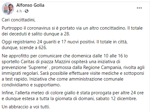 Lo apprendiamo dalla pagina Facebook del Sindaco di Aversa Alfonso Golia