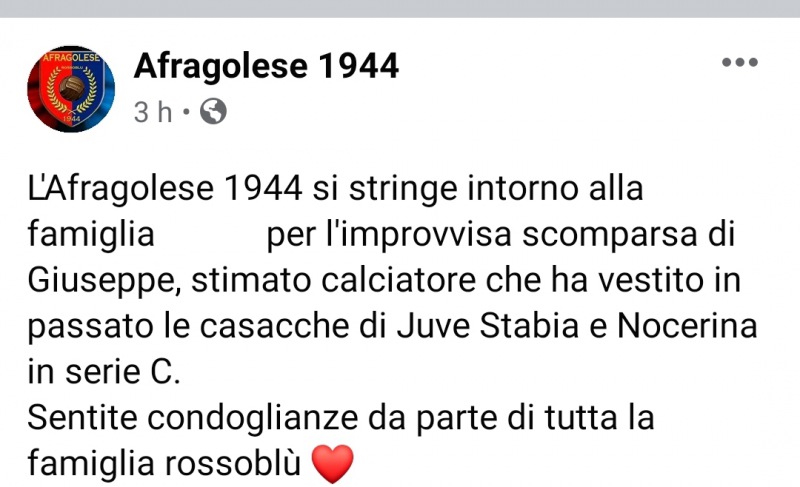 "L'Afragolese 1944 si stringe intorno alla famiglia...per l'improvvisa scomparsa di Giuseppe, stimato calciatore che ha vestito in passato le casacche di Juve Stabia e Nocerina in serie C. Sentite condoglianze da parte di tutta la famiglia rossoblù".