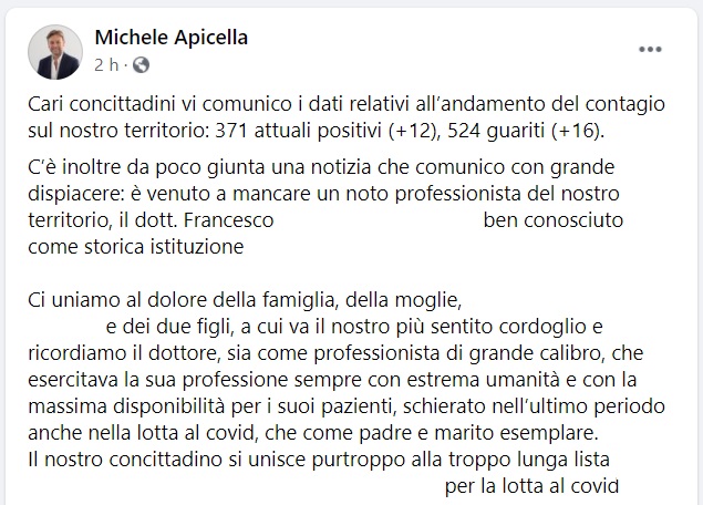 Questo quanto pubblicato sulla pagina facebook del Sindaco di Trentola Ducenta