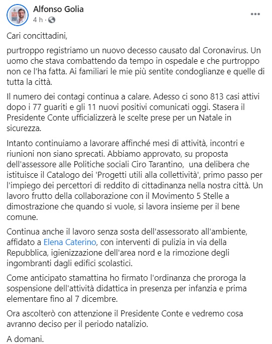 Questo quanto pubblicato sulla pagina facebook del Sindaco Golia di Aversa: