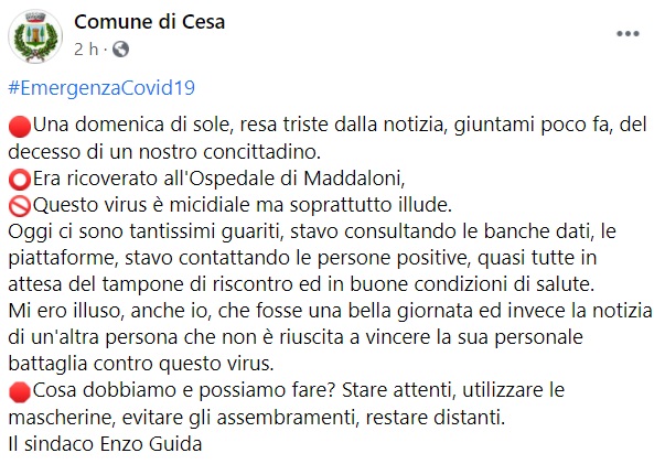 "Una domenica di sole, resa triste dalla notizia, giuntami poco fa, del decesso di un nostro concittadino. Era ricoverato all'Ospedale di Maddaloni, .... Questo virus è micidiale ma soprattutto illude. Oggi ci sono tantissimi guariti, stavo consultando le banche dati, le piattaforme, stavo contattando- si legge nella nota- le persone positive, quasi tutte in attesa del tampone di riscontro ed in buone condizioni di salute. Mi ero illuso, anche io, che fosse una bella giornata ed invece la notizia di un'altra persona che non è riuscita- si legge nella nota- a vincere la sua personale battaglia contro questo virus. Cosa dobbiamo e possiamo fare? Stare attenti, utilizzare le mascherine, evitare gli assembramenti, restare distanti. Il sindaco Enzo Guida"