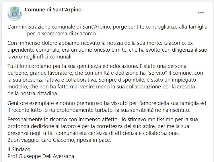 Questo quanto pubblicato sulla pagina facebook del Comune di Sant'Arpino