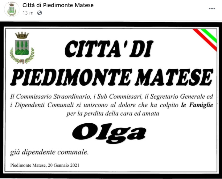 Questo parte di quanto apprendiamo dalla pagina facebook del Comune di Piedimonte Matese: