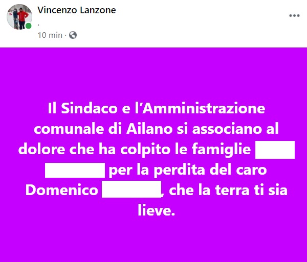 "Il Sindaco e l’Amministrazione comunale di Ailano si associano- si legge nella nota- al dolore che ha colpito le famiglie ... per la perdita del caro Domenico ..., che la terra ti sia lieve."