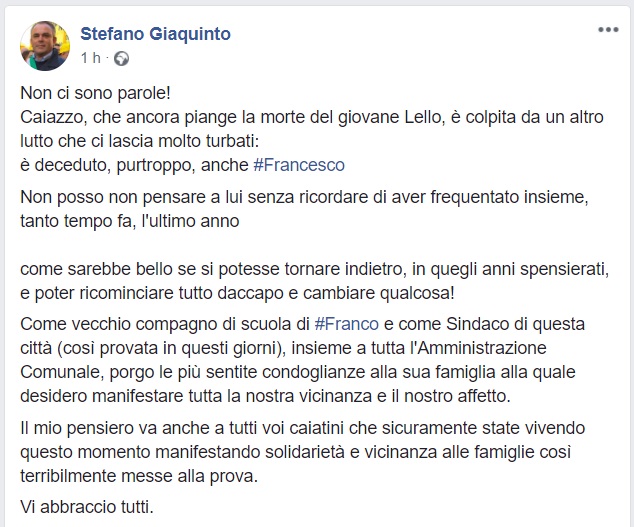 Questo quanto comunicato sul proprio profilo facebook dal Sindaco di Caiazzo