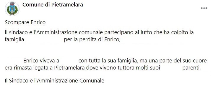 Questo quanto pubblicato sulla pagina facebook del Comune di Pietramelara