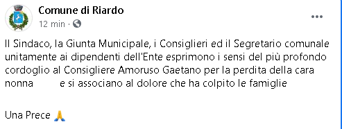 "Il Sindaco, la Giunta Municipale, i Consiglieri ed il Segretario comunale unitamente ai dipendenti dell'Ente esprimono i sensi del più profondo cordoglio al Consigliere Amoruso Gaetano per la perdita della cara nonna ...e si associano al dolore che ha colpito le famiglie... Una Prece".