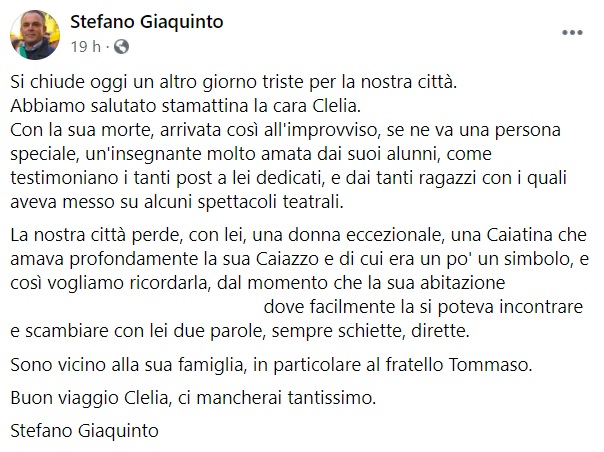 "Si chiude oggi un altro giorno triste per la nostra città. Abbiamo salutato stamattina la cara Clelia. Con la sua morte, arrivata così all'improvviso, se ne va una persona speciale, un'insegnante molto amata dai suoi alunni, come testimoniano- si legge nella nota- i tanti post a lei dedicati, e dai tanti ragazzi con i quali aveva messo su alcuni spettacoli teatrali. La nostra città perde, con lei, una donna eccezionale, una Caiatina che amava profondamente la sua Caiazzo e di cui era un po' un simbolo, e così vogliamo ricordarla, dal momento che la sua abitazione ... dove facilmente la si poteva incontrare e scambiare con lei due parole, sempre schiette, dirette. Sono vicino- si legge nella nota- alla sua famiglia, in particolare al fratello Tommaso. Buon viaggio Clelia, ci mancherai tantissimo. Stefano Giaquinto"