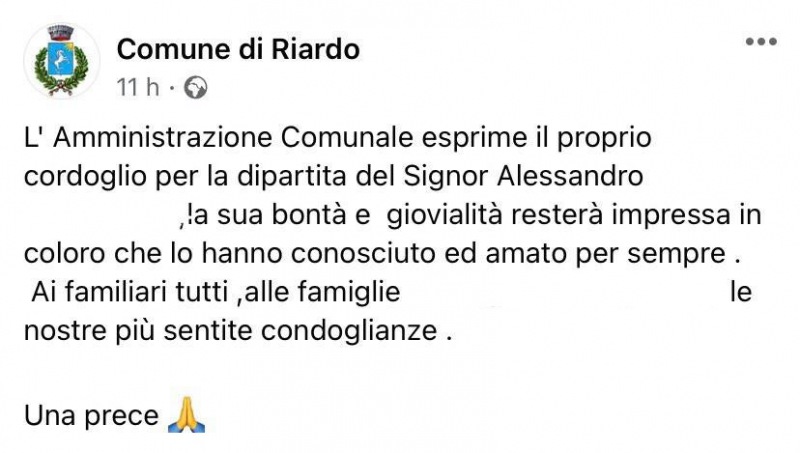 Questo il messaggio di cordoglio pubblicato sulla pagina Facebook del Comune di Riardo: "L'Amministrazione Comunale esprime il proprio cordoglio per la dipartita del Signor Alessandro ..., la sua bontà e giovialità - si legge nella nota - resterà impressa in coloro che lo hanno conosciuto ed amato per sempre. Ai familiari tutti, alle famiglie ... le nostre più sentite condoglianze. Una prece".