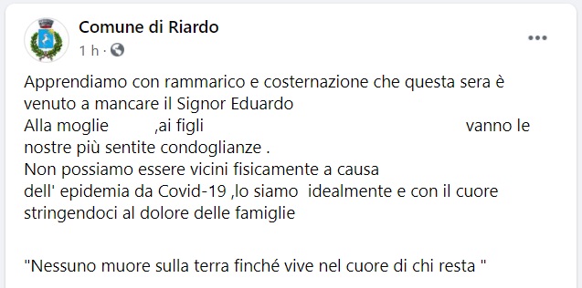 Questo il messaggio di cordoglio che apprendiamo dalla pagina facebook del Comune di Riardo: "Apprendiamo con rammarico e costernazione che questa sera è venuto a mancare il Signor Eduardo ... . Alla moglie ..., ai figli ... vanno - si legge nella nota - le nostre più sentite condoglianze. Non possiamo essere vicini fisicamente a causa dell'epidemia da Covid-19, lo siamo idealmente e con il cuore stringendoci al dolore delle famiglie ... - si legge nella nota -. "Nessuno muore sulla terra finché vive nel cuore di chi resta"."