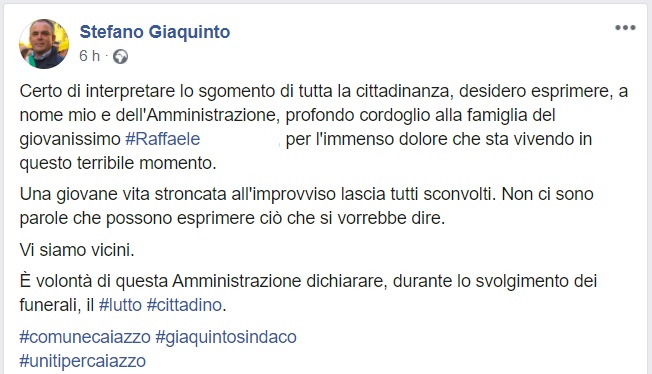 Questo quanto pubblicato dal Sindaco di Caiazzo Stefano Giaquinto