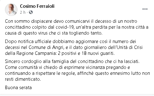 Lo apprendiamo dalla pagina Facebook del Sindaco di Angri, Cosimo Ferraioli.