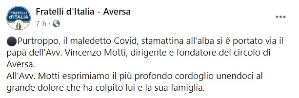 Questo il messaggio di cordoglio che apprendiamo dalla pagina facebook di Fratelli d'Italia - Aversa: "Purtroppo, il maledetto Covid, stamattina all’alba si è portato via il papà dell'Avv. Vincenzo Motti, dirigente e fondatore del circolo di Aversa - si legge nella nota -. All'Avv. Motti esprimiamo il più profondo cordoglio unendoci al grande dolore che ha colpito lui e la sua famiglia."