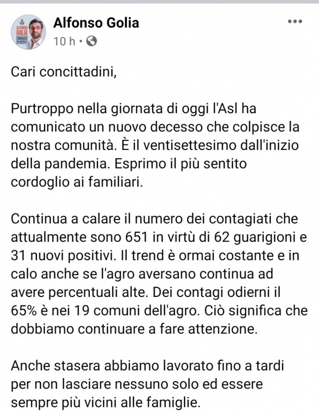 Lo apprendiamo dalla pagina Facebook del Sindaco di Aversa, Alfonso Golia.