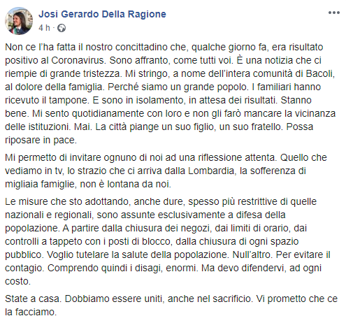 "Non ce l’ha fatta il nostro concittadino che, qualche giorno fa, era risultato positivo al Coronavirus. Sono affranto, come tutti voi. È una notizia che ci riempie di grande tristezza. Mi stringo, a nome dell’intera comunità di Bacoli, al dolore della famiglia. Perché siamo un grande popolo. I familiari hanno ricevuto il tampone. E sono in isolamento, in attesa dei risultati. Stanno bene. Mi sento quotidianamente con loro e non gli farò mancare la vicinanza delle istituzioni. Mai. La città piange un suo figlio, un suo fratello. Possa riposare in pace. Mi permetto di invitare ognuno di noi ad una riflessione attenta. Quello che vediamo in tv, lo strazio che ci arriva dalla Lombardia, la sofferenza di migliaia famiglie, non è lontana da noi. Le misure che sto adottando, anche dure, spesso più restrittive di quelle nazionali e regionali, sono assunte esclusivamente a difesa della popolazione. A partire dalla chiusura dei negozi, dai limiti di orario, dai controlli a tappeto con i posti di blocco, dalla chiusura di ogni spazio pubblico. Voglio tutelare la salute della popolazione. Null’altro. Per evitare il contagio. Comprendo quindi i disagi, enormi. Ma devo difendervi, ad ogni costo. State a casa. Dobbiamo essere uniti, anche nel sacrificio. Vi prometto che ce la facciamo."
