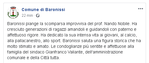 "Baronissi piange la scomparsa improvvisa del prof. Nando Nobile. Ha cresciuto generazioni di ragazzi amandoli e guidandoli con paterno e affettuoso rigore. Ha dedicato la sua intensa vita ai giovani, al calcio, alla pallacanestro, allo sport. Baronissi saluta una figura storica che ha molto stimato e amato. Le condoglianze più sentite e affettuose alla famiglia del sindaco Gianfranco Valiante, dell'amministrazione comunale e della Città tutta."