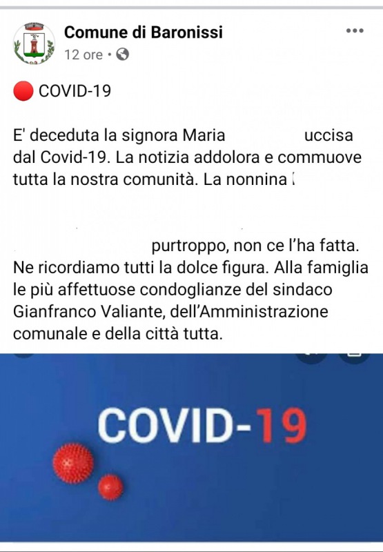 E' deceduta la signora Maria , uccisa dal Covid-19. La notizia addolora e commuove tutta la nostra comunità. La nonnina purtroppo, non ce l’ha fatta. Ne ricordiamo tutti la dolce figura. Alla famiglia le più affettuose condoglianze del sindaco Gianfranco Valiante, dell’Amministrazione comunale e della città tutta."