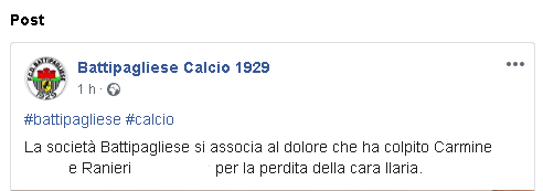 "La società Battipagliese si associa al dolore che ha colpito Carmine... e Ranieri ...per la perdita della cara Ilaria."