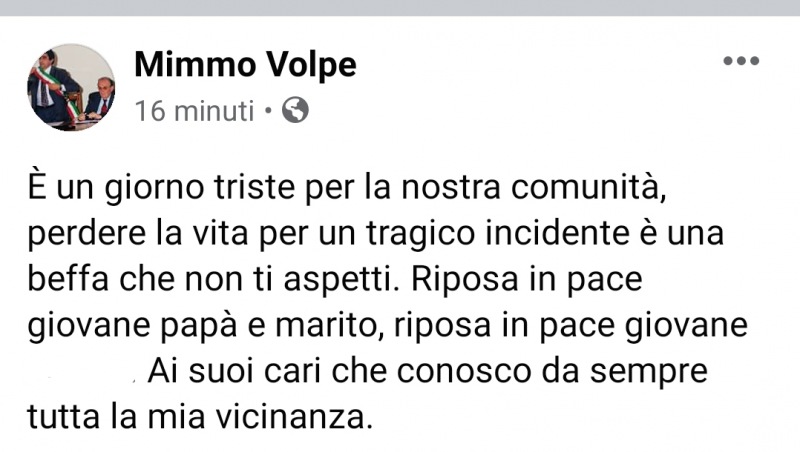 "È un giorno triste per la nostra comunità, perdere la vita per un tragico incidente è una beffa che non ti aspetti. Riposa in pace giovane papà e marito, riposa in pace giovane ... Ai suoi cari che conosco da sempre tutta la mia vicinanza."