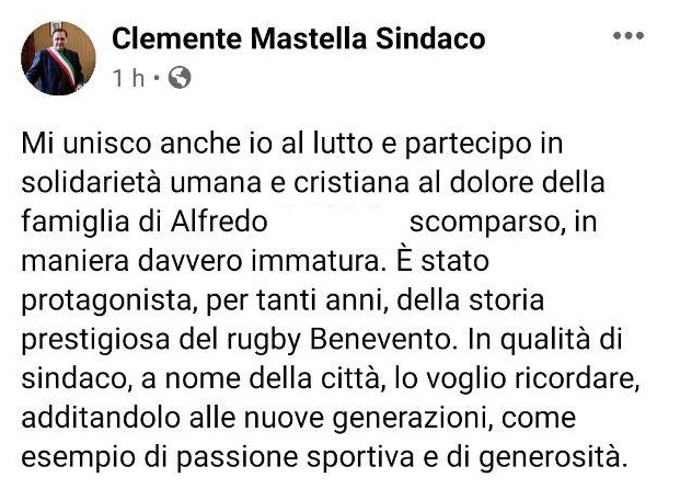 "Mi unisco anche io al lutto e partecipo, in solidarietà umana e cristiana, al dolore della famiglia di Alfredo..., scomparso, in maniera davvero immatura. È stato protagonista, per tanti anni, della storia prestigiosa del rugby Benevento. In qualità di sindaco, a nome della città, lo voglio ricordare, additandolo alle nuove generazioni, come esempio di passione sportiva e di generosità."