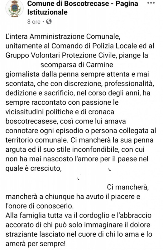 "L'intera Amministrazione Comunale, unitamente al Comando di Polizia Locale ed al Gruppo Volontari Protezione Civile, piange la ... scomparsa di Carmine ..., giornalista dalla penna sempre attenta e mai scontata, che con discrezione, professionalità, dedizione e sacrificio, nel corso degli anni, ha sempre raccontato con passione le vicissitudini politiche e di cronaca boscotrecasese, così come lui amava connotare ogni episodio o persona collegata al territorio comunale. Ci mancherà la sua penna arguta ed il suo stile inconfondibile, con cui non ha mai nascosto l'amore per il paese nel quale è cresciuto, ha mosso...Ci mancherà, mancherà a chiunque ha avuto il piacere e l'onore di conoscerlo. Alla famiglia tutta va il cordoglio e l'abbraccio accorato di chi può solo immaginare il dolore straziante lasciato nel cuore di chi lo ama e lo amerà per sempre!"