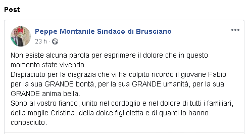 "Non esiste alcuna parola per esprimere il dolore che in questo momento state vivendo. Dispiaciuto per la disgrazia che vi ha colpito ricordo il giovane Fabio per la sua GRANDE bontà, per la sua GRANDE umanità, per la sua GRANDE anima bella. Sono al vostro fianco, unito nel cordoglio e nel dolore di tutti i familiari, della moglie Cristina, della dolce figlioletta e di quanti lo hanno conosciuto."