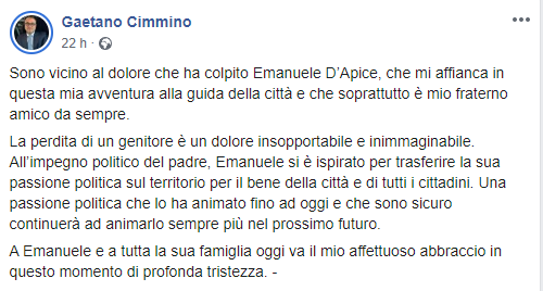 "Sono vicino al dolore che ha colpito Emanuele D’Apice, che mi affianca in questa mia avventura alla guida della città e che soprattutto è mio fraterno amico da sempre. La perdita di un genitore è un dolore insopportabile e inimmaginabile. All’impegno politico del padre, Emanuele si è ispirato per trasferire la sua passione politica sul territorio per il bene della città e di tutti i cittadini. Una passione politica che lo ha animato fino ad oggi e che sono sicuro continuerà ad animarlo sempre più nel prossimo futuro. A Emanuele e a tutta la sua famiglia oggi va il mio affettuoso abbraccio in questo momento di profonda tristezza."