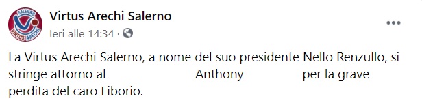 "La Virtus Arechi Salerno, a nome del suo presidente Nello Renzullo, si stringe attorno al ... Anthony ... per la grave perdita del caro Liborio."