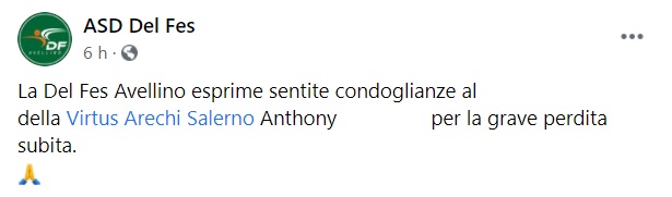 "La Del Fes Avellino esprime sentite condoglianze al ... della Virtus Arechi Salerno Anthony ... per la grave perdita subita."