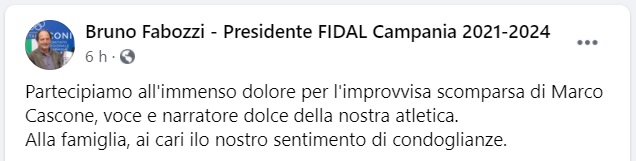Questo il messaggio di cordoglio pubblicato sulla pagina facebook di Bruno Fabozzi, presidente FIDAL Campania: "Partecipiamo all'immenso dolore per l'improvvisa scomparsa di Marco Cascone - si legge nella nota -, voce e narratore dolce della nostra atletica. Alla famiglia, ai cari il nostro sentimento di condoglianze."