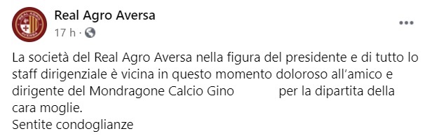 "La società del Real Agro Aversa nella figura del presidente e di tutto lo staff dirigenziale è vicina in questo momento doloroso all’amico e dirigente del Mondragone Calcio Gino ... per la dipartita della cara moglie. Sentite condoglianze"