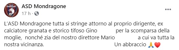 "L’ASD Mondragone tutta si stringe attorno al proprio dirigente, ex calciatore granata e storico tifoso Gino ... per la scomparsa della moglie, nonché zia del nostro direttore Mario ... a cui va tutta la nostra vicinanza. Un abbraccio"