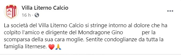"La società del Villa Literno Calcio si stringe intorno al dolore che ha colpito l'amico e dirigente del Mondragone Gino ... per la scomparsa della sua cara moglie. Sentite condoglianze da tutta la famiglia liternese"