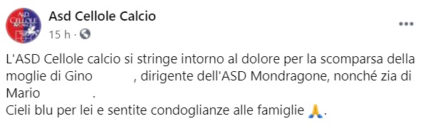 "L'ASD Cellole calcio si stringe intorno al dolore per la scomparsa della moglie di Gino ... , dirigente dell'ASD Mondragone, nonché zia di Mario ... Cieli blu per lei e sentite condoglianze alle famiglie"