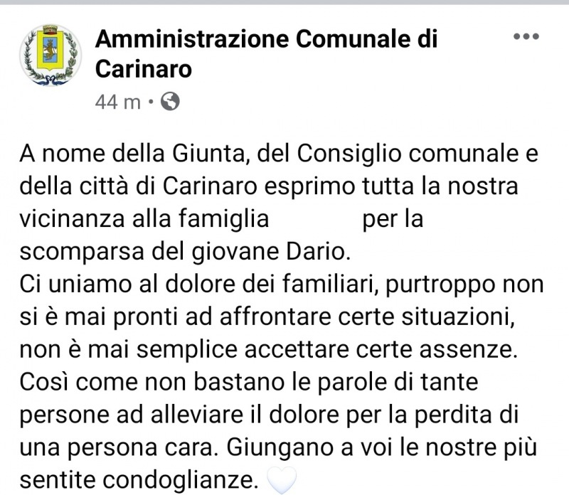 "A nome della Giunta, del Consiglio comunale e della città di Carinaro esprimo tutta la nostra vicinanza alla famiglia ...per la scomparsa del giovane Dario. Ci uniamo al dolore dei familiari, purtroppo non si è mai pronti ad affrontare certe situazioni, non è mai semplice accettare certe assenze. Così come non bastano le parole di tante persone ad alleviare il dolore per la perdita di una persona cara. Giungano a voi le nostre più sentite condoglianze."