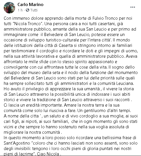 Lo apprendiamo dalla bacheca Facebook del Sindaco di Caserta, Carlo Marino.
