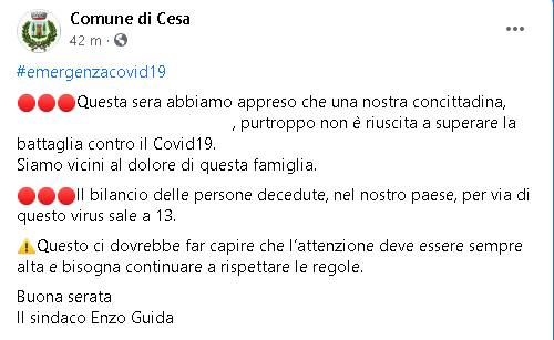 "Questa sera abbiamo appreso che una nostra concittadina, ... purtroppo non è riuscita a superare la battaglia contro il Covid19. Siamo vicini al dolore di questa famiglia. Il bilancio delle persone decedute, nel nostro paese, per via di questo virus sale a 13. Questo ci dovrebbe far capire che l’attenzione deve essere sempre alta e bisogna continuare a rispettare le regole. Buona serata. Il sindaco Enzo Guida".