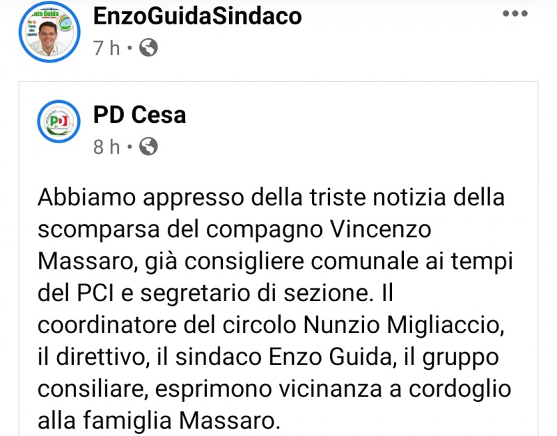 Lo apprendiamo dalla pagina Facebook del Sindaco di Cesa, Enzo Guida.